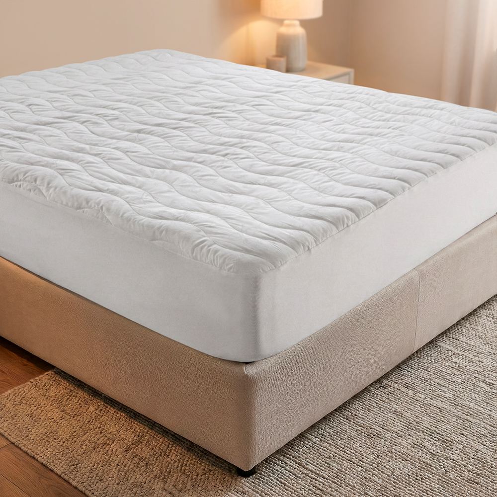This mattress protector is filled with 600g of 70% cotton and 30% fiber, offering a stylish look with a printed cotton boll pattern.